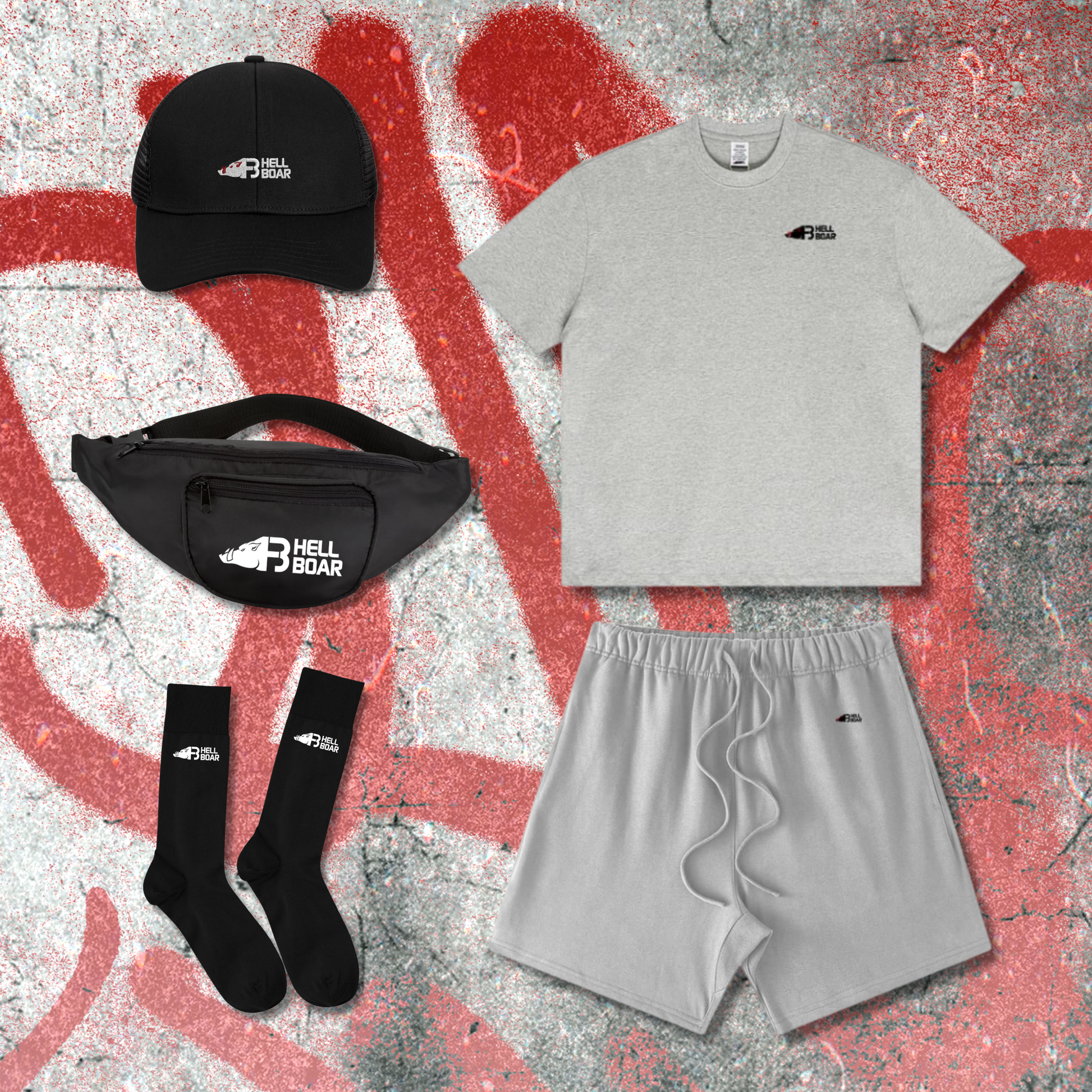 1× Grey premium shorts with Hell Boar branding;
