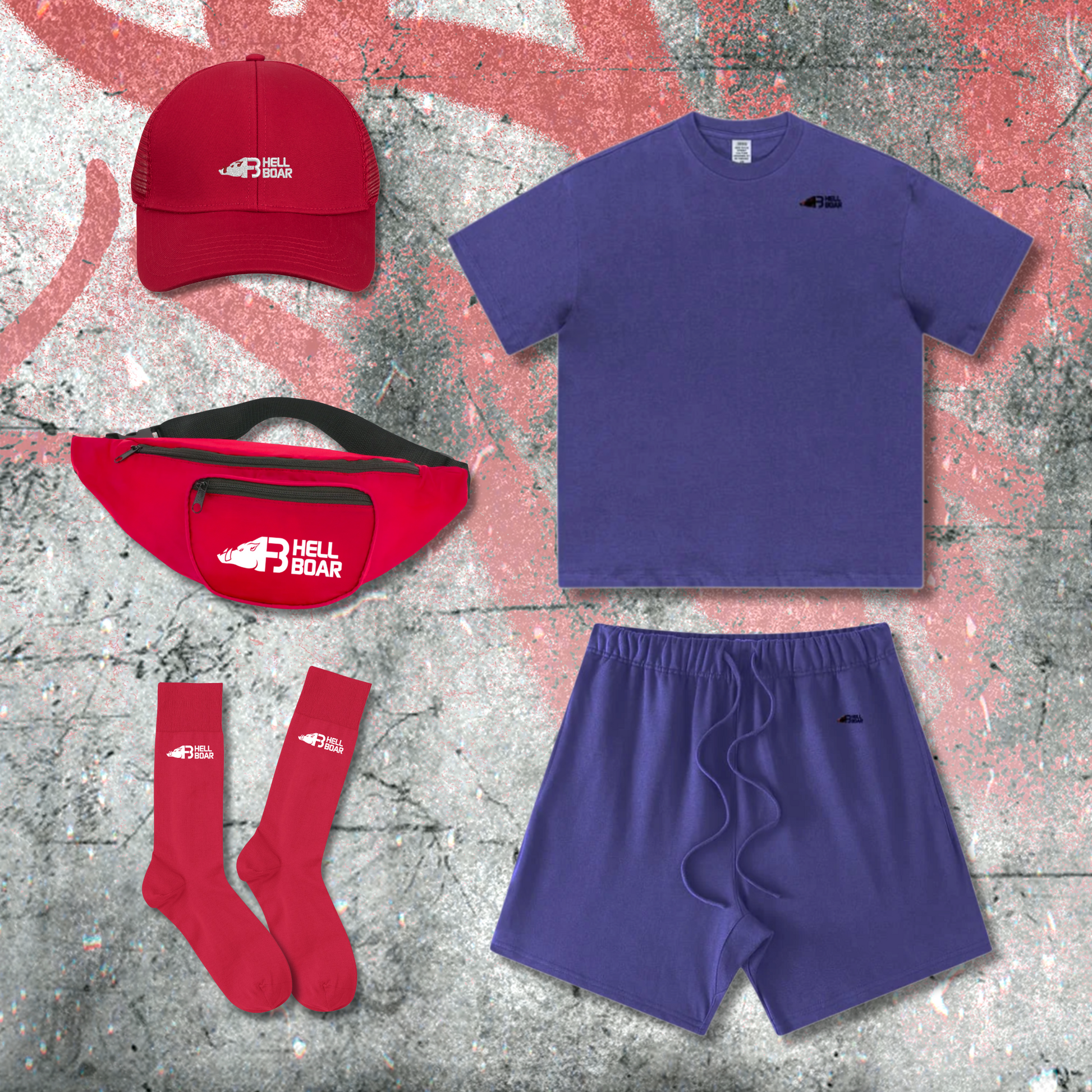Make a statement with vibrant contrasts. This premium set fuses bold violet with fiery red details for a fearless street-ready outfit.